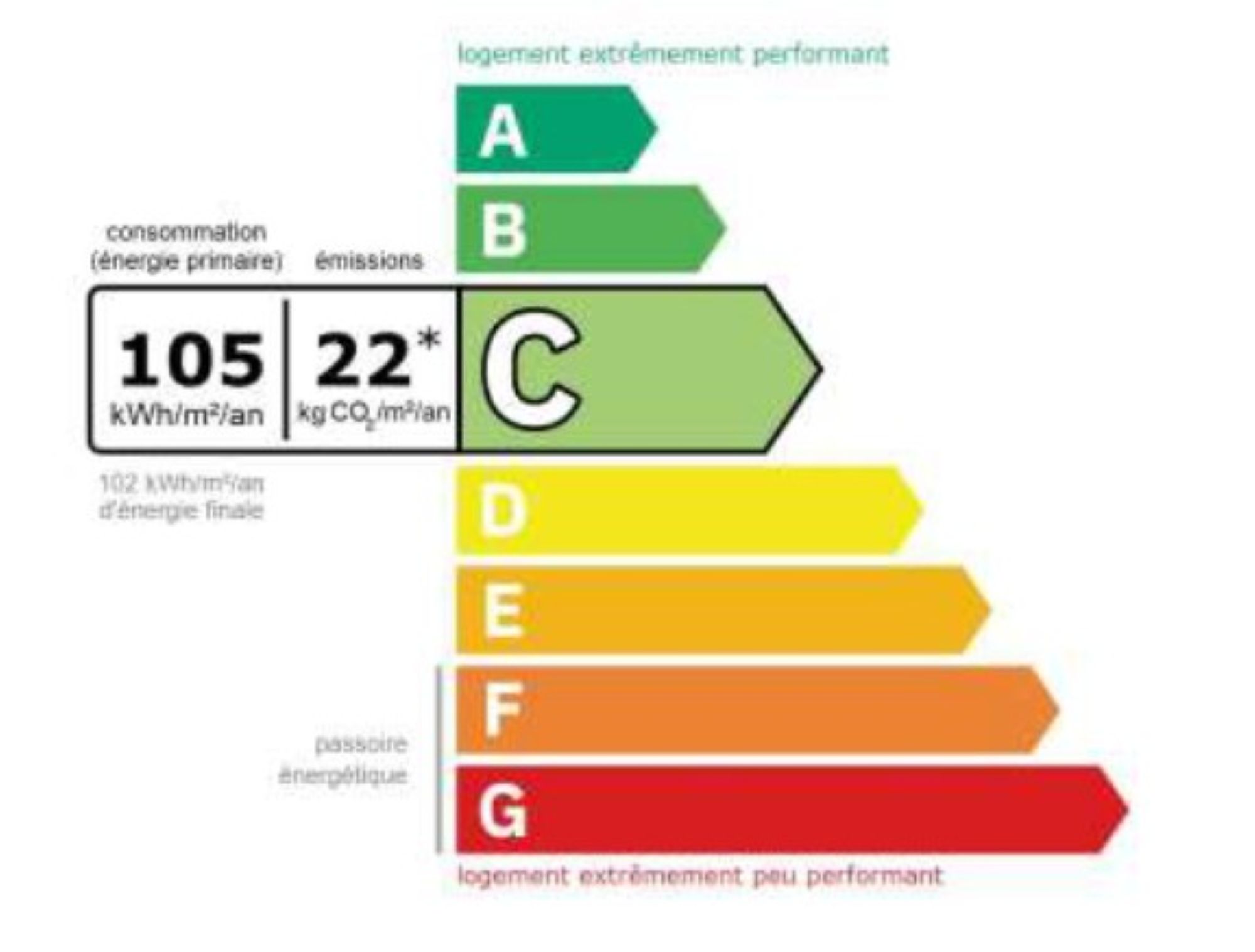 - Consommation énergie primaire : 105 kWh/m²/an (Classe C)